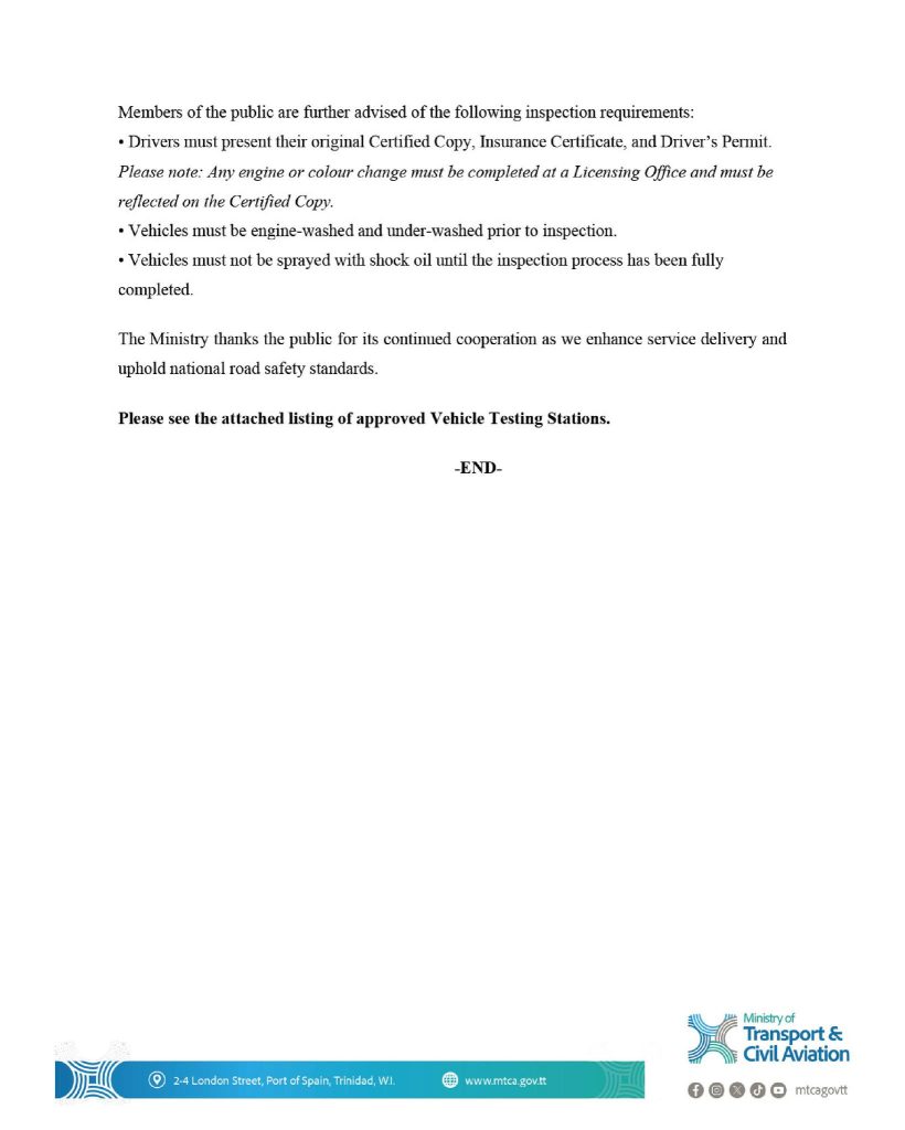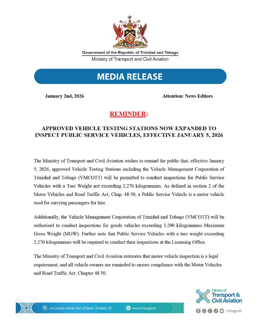 The Ministry of Transport and Civil Aviation wishes to remind the public that, effective January 5, 2026, approved Vehicle Testing Stations including the Vehicle Management Corporation of Trinidad and Tobago (VMCOTT) will be permitted to conduct inspections for Public Service Vehicles with a Tare Weight not exceeding 2,270 kilogrammes. As defined in section 2 of the Motor Vehicles and Road Traffic Act, Chap. 48:50, a Public Service Vehicle is a motor vehicle used for carrying passengers for hire.