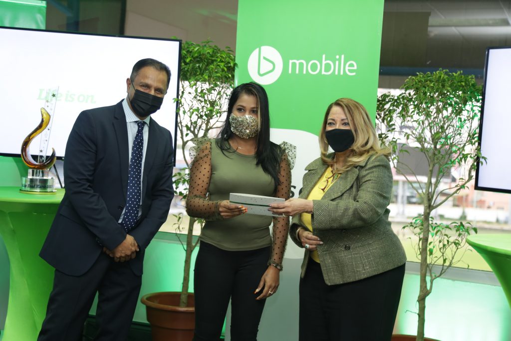George Singh, CEO, Southex Promotions and Lisa Agard, CEO TSTT join Nisha Ramsook to celebrate her victory as the 2021 Chutney Soca Queen