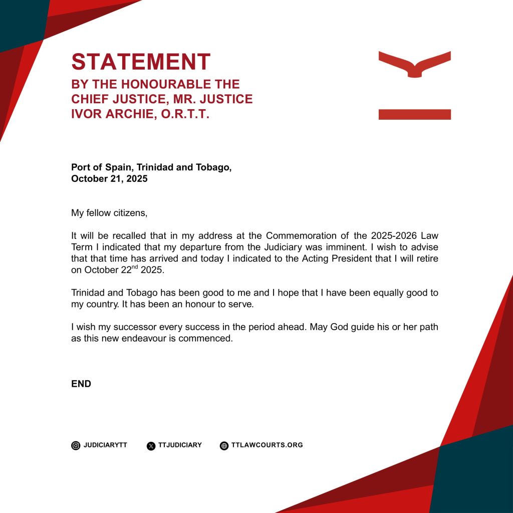 “It will be recalled that in my address at the Commemoration of the 2025-2026 Law Term I indicated that my departure from the Judiciary was imminent. I wish to advise that that time has arrived and today I indicated to the Acting President that I will retire on October 22nd 2025. Trinidad and Tobago has been good to me and I hope that I have been equally good to my country. It has been an honour to serve. I wish my successor every success in the period ahead. May God guide his or her path as this new endeavour is commenced.”