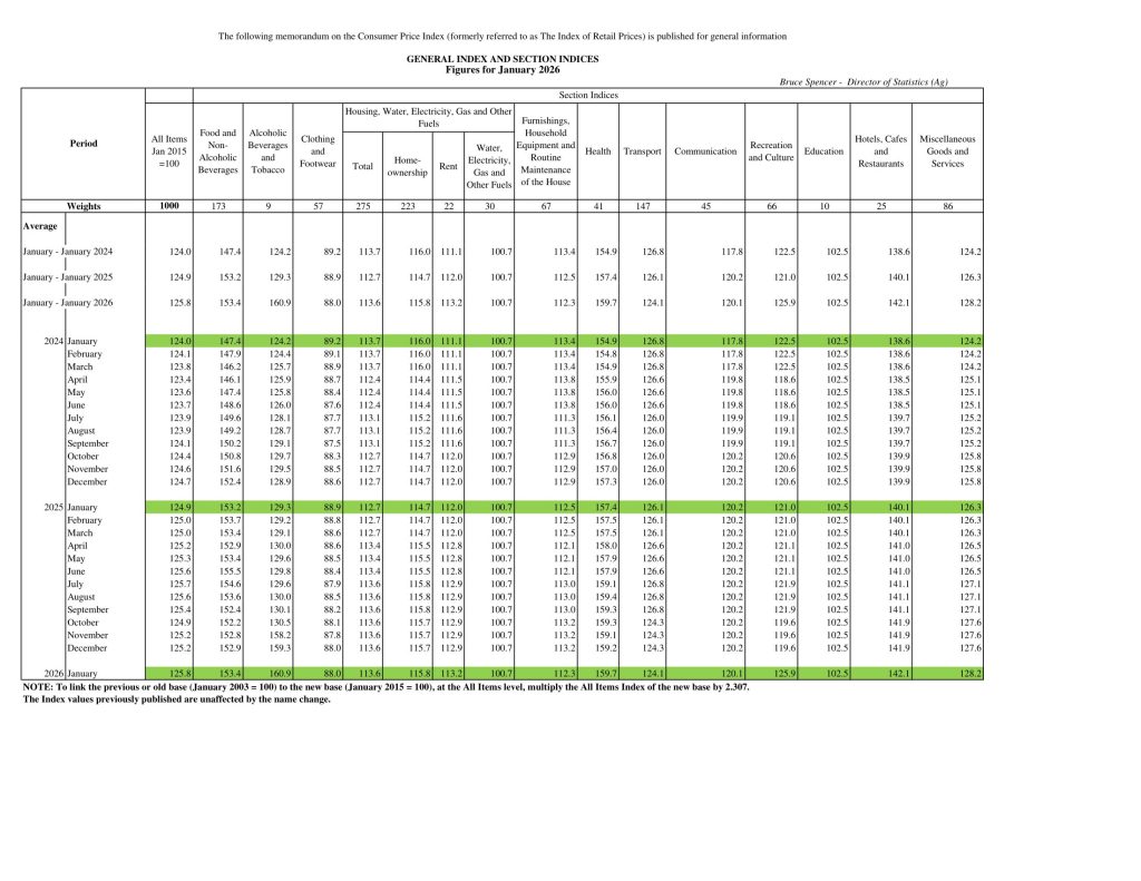 The All Items Index calculated from the prices collected for the month of January 2026 was 125.8, representing an increase of 0.6 points or 0.5% above the All Items Index for December 2025.