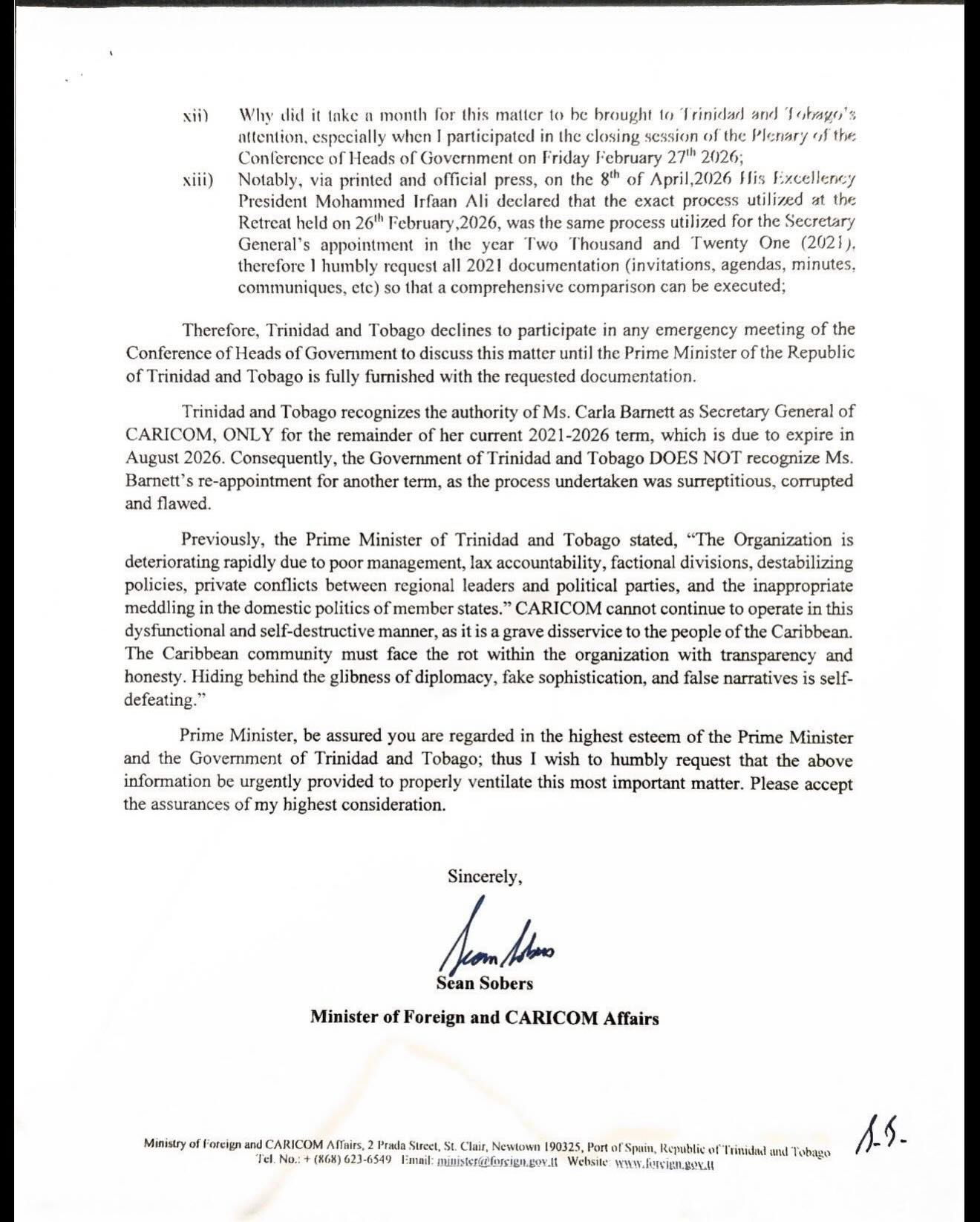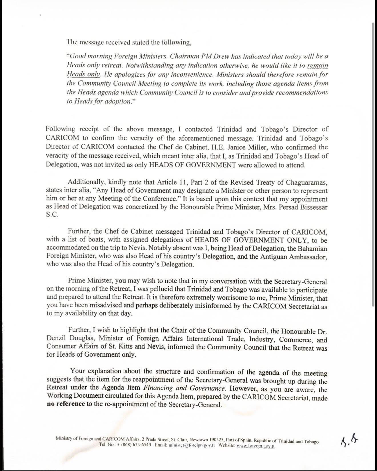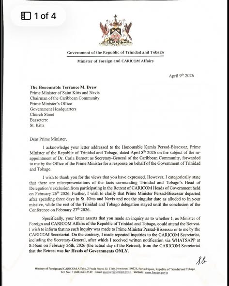 In a statement, Persad-Bissessar confirmed that correspondence from Minister of Foreign and CARICOM Affairs Sean Sobers has been made public. This follows the leak of a letter from St. Kitts and Nevis Prime Minister Terrance Drew dated April 8th.