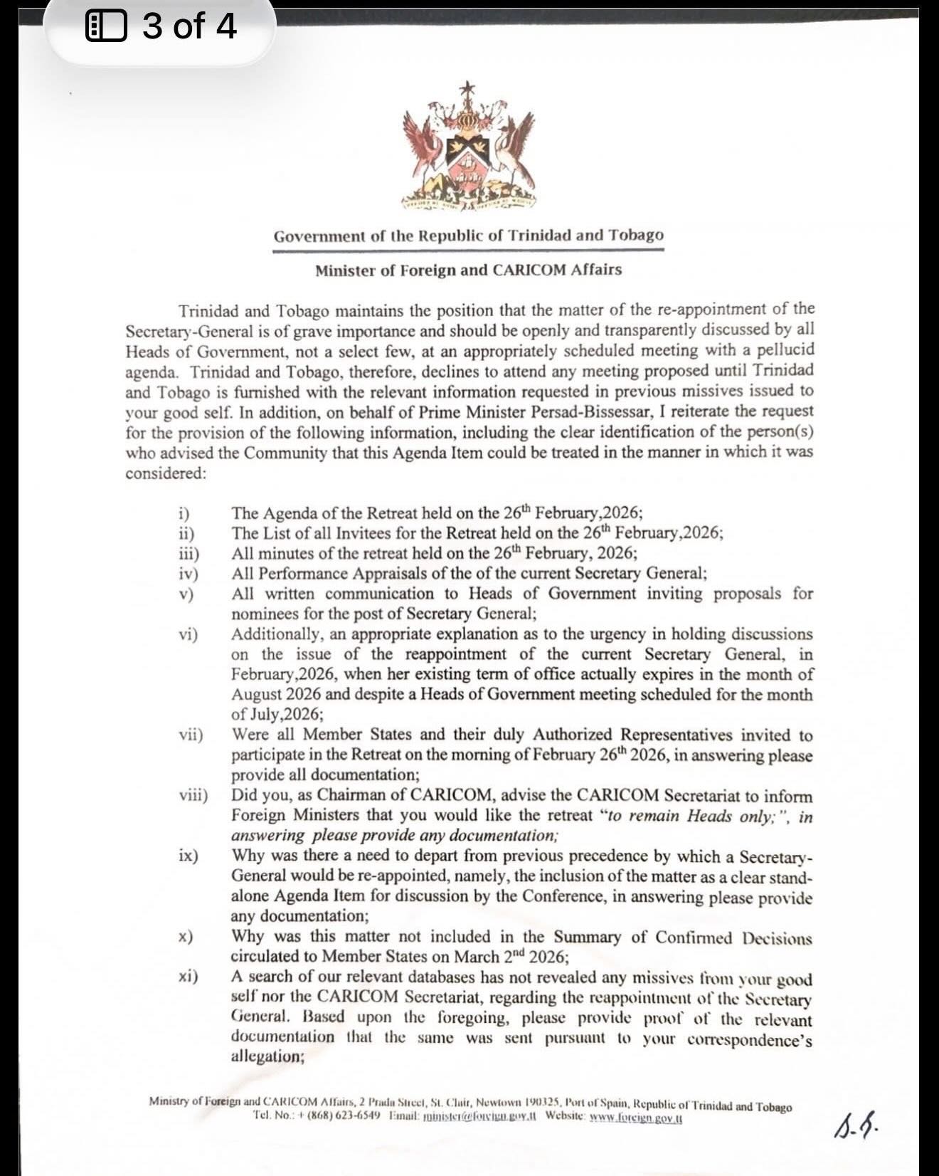 Trinidad and Tobago is now demanding records and says it will not engage further without greater transparency. The CARICOM Secretariat has not yet responded.