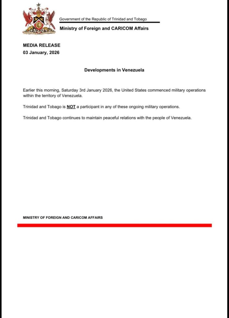 The full statement reads: “Earlier this morning, Saturday 3rd January 2026, the United States commenced military operations within the territory of Venezuela. Trinidad and Tobago is NOT a participant in any of these ongoing military operations. Trinidad and Tobago continues to maintain peaceful relations with the people of Venezuela.”