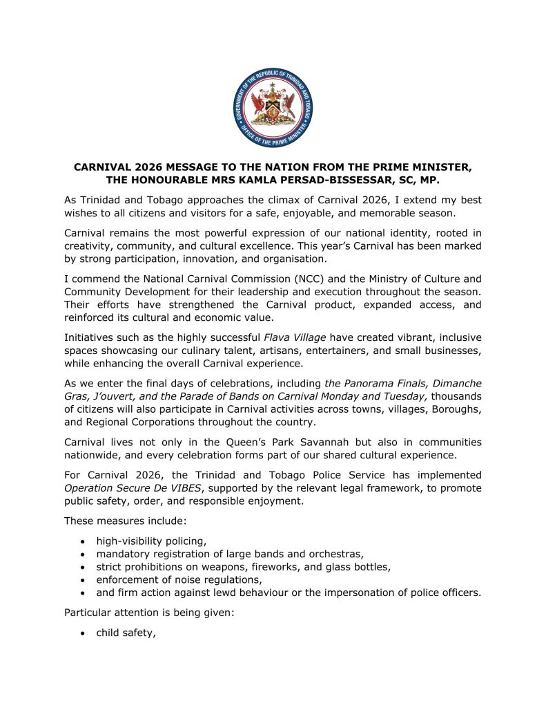 With the 2026 Carnival season drawing to a close, Prime Minister Kamla Persad-Bissessar SC has issued a clear appeal to citizens and visitors to prioritise safety while making the most of the celebrations.