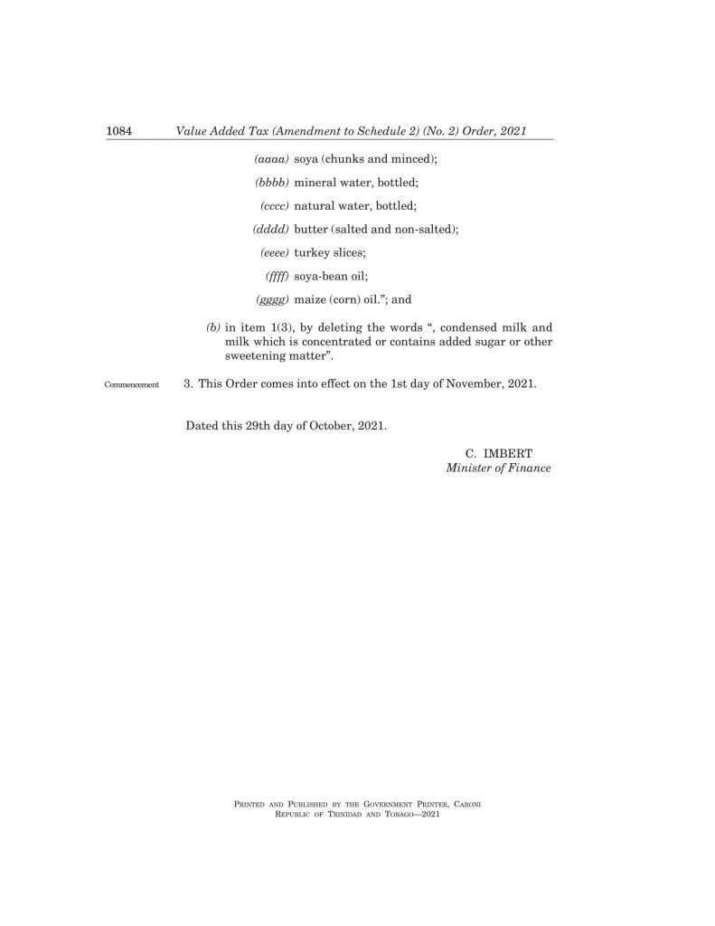 The Minister of Finance, Colm Imbert, wishes to advise that the supplementary list of Basic Food Items that will be VAT-Free (Zero-Rated) from Monday, November 1st, 2021, has been published as The Value Added Tax (Amendment to Schedule 2)(No. 2) Order, 2021; Legal Notice No. 259, dated October 29th, 2021 (attached).