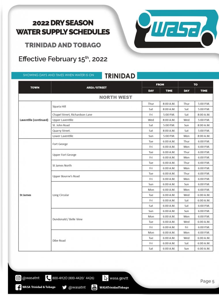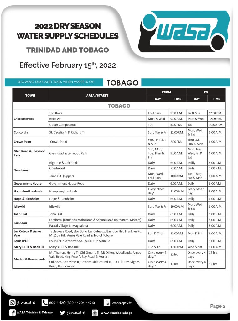 According to WASA in keeping with their 2022 Water Supply Management Plan, the water supply schedules to the country have been adjusted, in view of the current Dry Season conditions and the need to manage the levels at our main impounding reservoirs. See the updated schedule below.